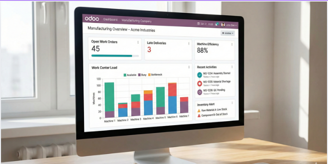 Odoo provides real-time work order tracking, live capacity planning, and digital shop floor updates, allowing managers to detect and resolve delays immediately.