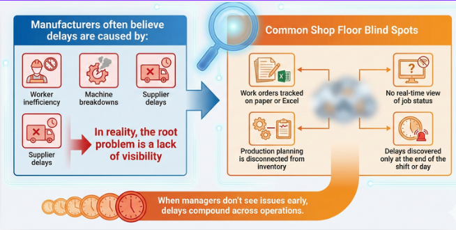 Production delays are usually caused by lack of real-time shop floor visibility, material shortages, poor capacity planning, and delayed reporting—not just machine or labor issues.