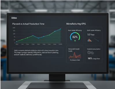 Odoo compares planned production time with actual execution time. This helps managers identify inefficiencies, improve future planning, and set realistic delivery commitments.