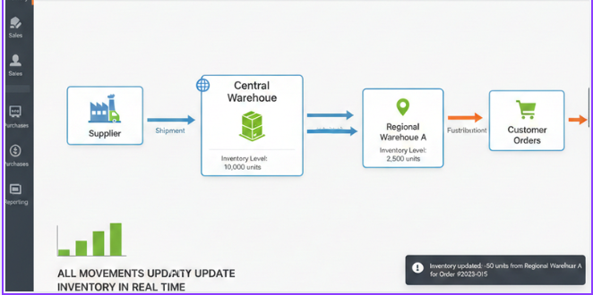 When stock moves from Warehouse A to Warehouse B, Odoo updates quantities instantly. Sales teams see accurate availability. Procurement teams trigger replenishment automatically when minimum stock thresholds are reached.