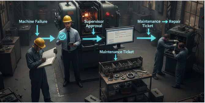 Legacy ERP or standalone maintenance tools often operate in silos. Production teams log issues separately. Maintenance teams respond based on manual tickets. Procurement is notified only after part shortages occur.