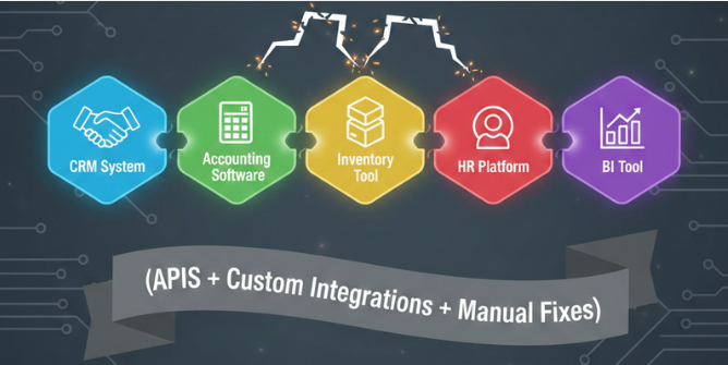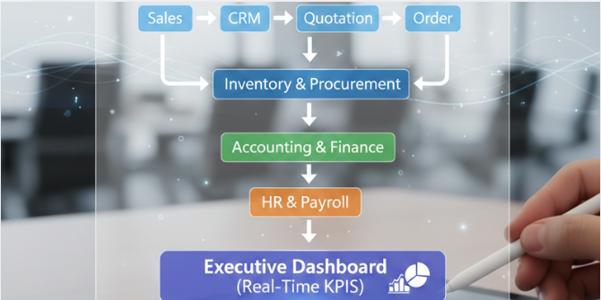 Across industries — manufacturing, wholesale distribution, retail, professional services — enterprises are facing a silent operational crisis. Over the years, departments adopted tools independently: CRM for sales, separate accounting software, spreadsheets for operations, standalone HR systems, third-party inventory tools, BI dashboards disconnected from core data.